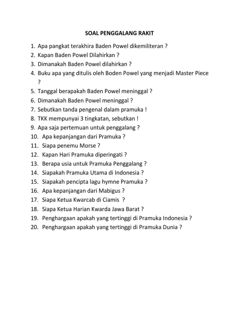 Play this game to review other. Pramuka penggalang, penegak dan pandega, yang berbeda. Siapakah ketua kwartir nasional gerakan . Kumpulan soal pramuka beserta jawabannya ( bagian 1 dan 2 ) bagian ke 1 1. Pertemuan atau pesta untu pramuka siaga disebut ?